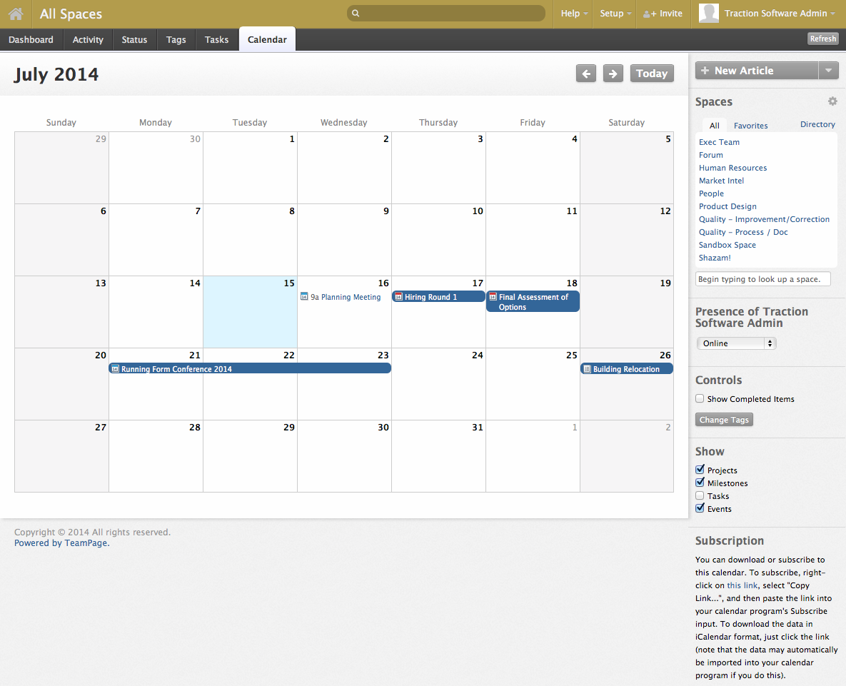 Participants' desktop calendars will automatically synchronize via email invitations. And you can subscribe to an iCalendar feed for any calendar you see in Teampage, letting you see important happenings and committments in your Teampage server when you're reviewing your personal Outlook, Mac, or mobile calendar.
