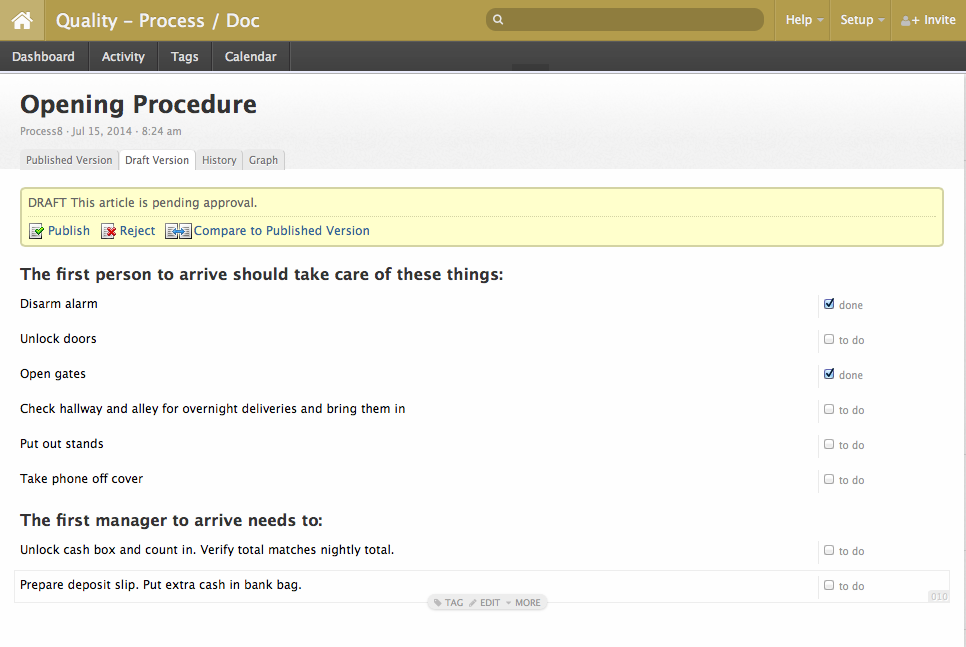 Who needs to do this? By when? How long should it take? Tasks go beyond line-item to-do/done status, letting you add assignees, due dates, and people to notify. Like everything in Teampage, they can be connected to any paragraph. Or they can stand on their own.