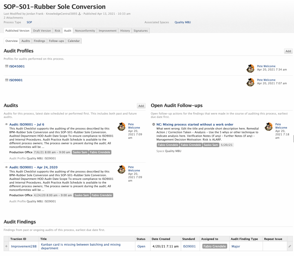 Each Process page, whether SOP or WIN, has tabs to show related records. This includes Nonconformity, Risk, Improvement and Audit. Each of those tabs might include a few types of records. Examples of the Nonconformity and Audit tabs are shown in their sections below.