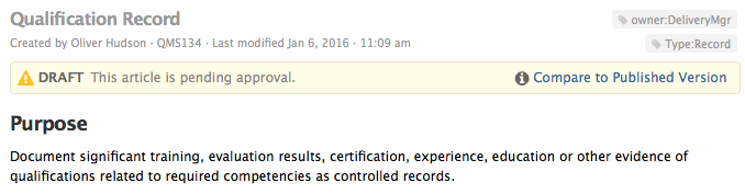 Your Quality Team decides when changes to a document are published to the organization. Until then, only the people they designate, for example reviewers, can see the draft version of the document.