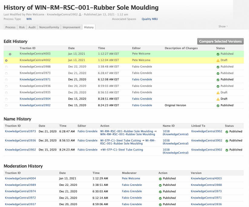 Process documentation can be marked as a Standard Operating Procedure (SOP) or Work Instruction (WIN). Moderation and approval controls ensure that people are working from the current document. The edit history, complete with version comments, will make your auditor drool.