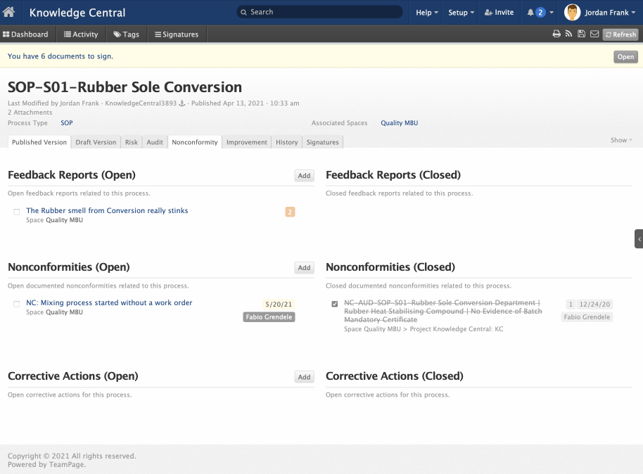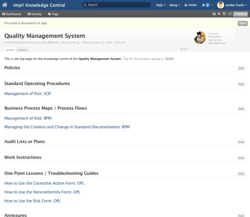 The IMPI / TeamPage Quality Suite includes IMPI Knowledge Central space and a "Your Company" Knowledge Central space. The IMPI space includes SOPs, Work Instructions, One Point Lessons and more on everything from how to handle a Nonconformity to how to manage Risk and execute on Improvement Projects. The "Your Company" Knowledge Central space is a starting structure for your own process documentation and it is seeded with templates for nonconformities, risk matrices and much more.