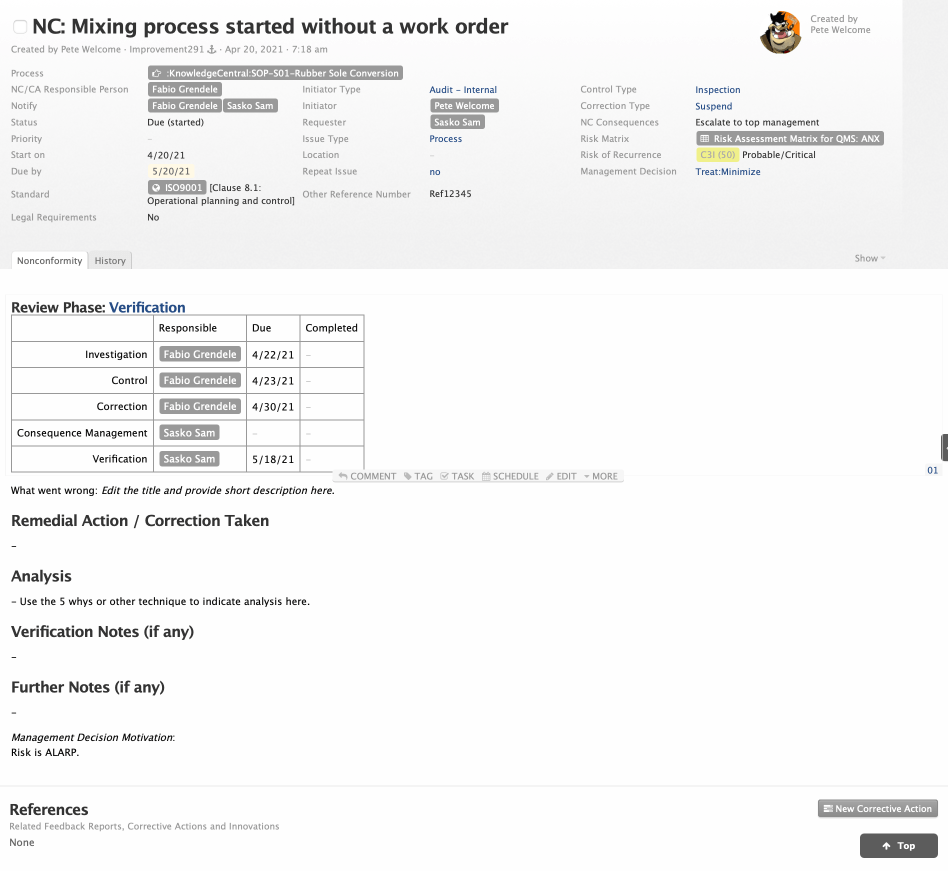 And when a Nonconformity leads to a Corrective Action, the key information carries over while a bi-directional link connects the two records to each other, as well as to the parent SOP.