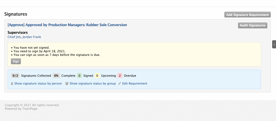 TeamPage makes managing this easy by letting you attach one or more Signature Requirements to any document. Signature requirements say who needs to sign off on the document, for what purpose, when, and how frequently.
