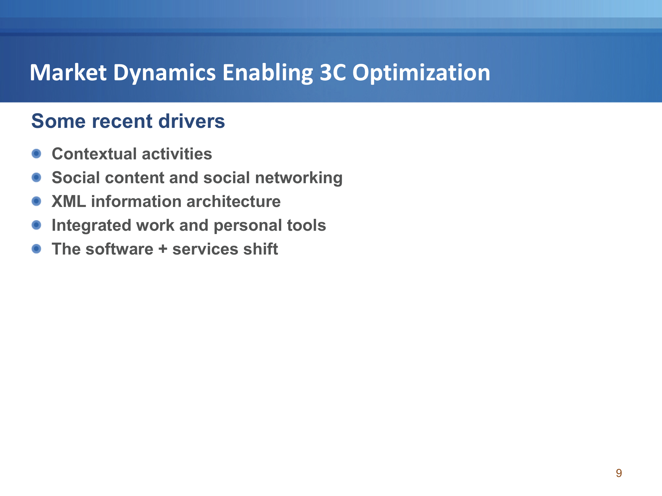 Revisiting the list of market dynamics enabling 3C optimization in 2010: