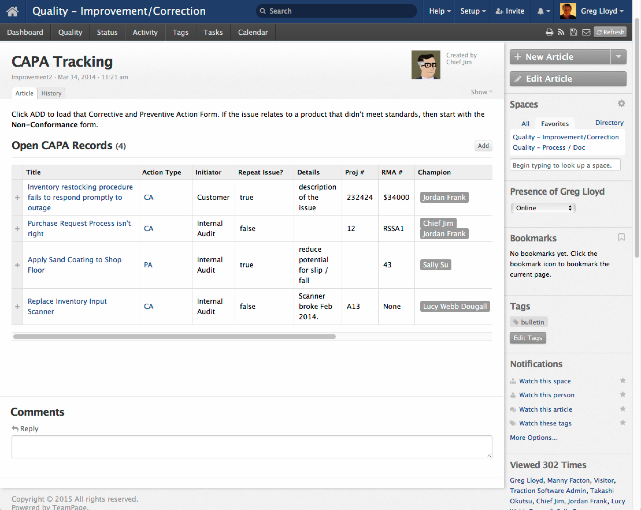Traction® TeamPage Winter 2015 Release introduces a new TeamPage Quality Management option. The Quality Management module adds Feedback, Non-Conformance, and Corrective Action forms and dashboards to TeamPage's standard support for authoring, delivery, and tracking of quality and compliance documentation. The new Quality forms and dashboards make it simple to manage the full life cycle for manufacturing, operations, and other procedures based on ISO 9001 or other compliance standards. Signature Requirements is a new capability which lets you require people to sign TeamPage articles either once or on a recurring basis. Signature Requirements can be used to collect approvals for publication, confirm that a document has been reviewed or a process followed, or for any other situation where a set of users and groups must explicitly acknowledge that they have reviewed an article. Signature Requirements is included with the Quality Management option, and is also available as separately priced independent option, please contact us for details.