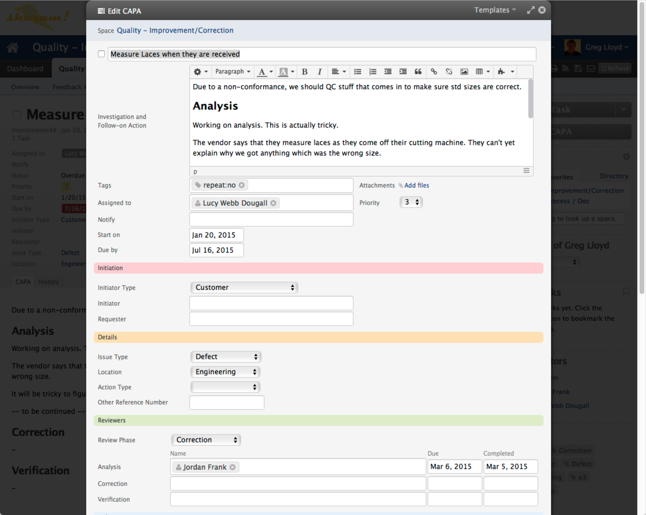 The Quality Management module also adds new Feedback Report, Non-Conformance, and CAPA forms to TeamPage. These Quality forms work like specialized TeamPage tasks, with additional pull down and fill in the blank options used to classify, assign and track Quality related actions. Action tracking, calendar notification, history, search, personal worklist, email digest, and other capabilities work just like they do with standard TeamPage tasks. This enables you to not only track the status of Feedback, Non-Conformance, and CAPA items, but also to use TeamPage collaborative and action tracking capabilities to work with your team to diagnose the problem, come up with a solution, then implement and test the updated procedures - while keeping everyone on the same page. TeamPage streamlines and simplifies the compliance process for everyone.