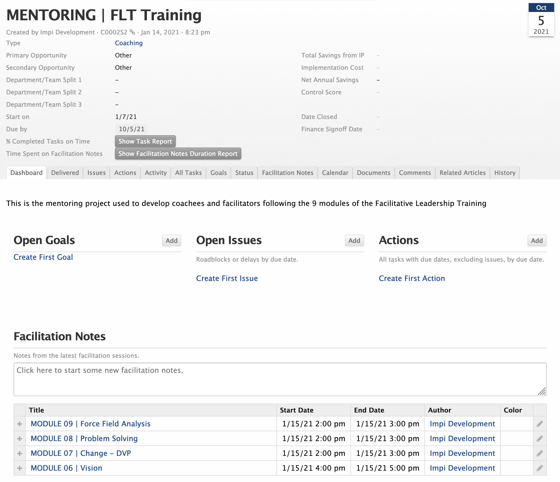 Coaching and mentoring improvement projects also have a new inline session event form for recording useful notes and discussion points from a coaching or mentoring session. The built-in action tracking provides a framework for a systematic approach to achieving specific target conditions for the coachee/