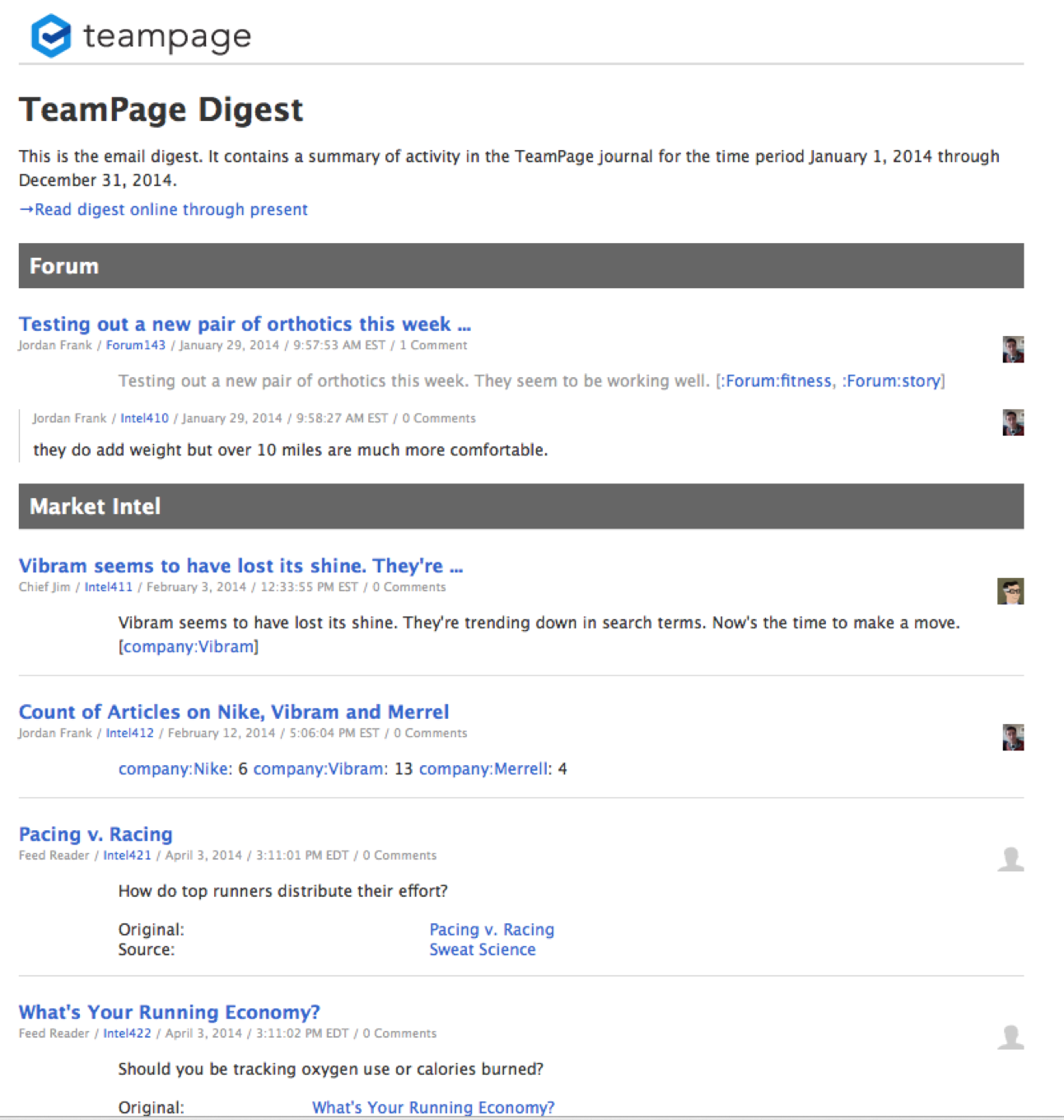 Information posted to TeamPage appears in a user-specific email digest and secure TeamPage dashboards. The automated email digest enables busy executives to remain peripherally aware of market activities without the burden of trying to make sense of and file away numerous disjointed email messages.